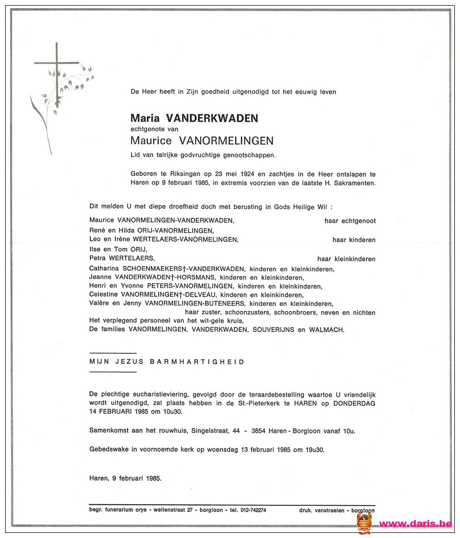Vanderkwaden, Maria, geboren op 23-05-1924 te Riksingen, overleden op 09-02-1985 te Haren op 60-jarige leeftijd.