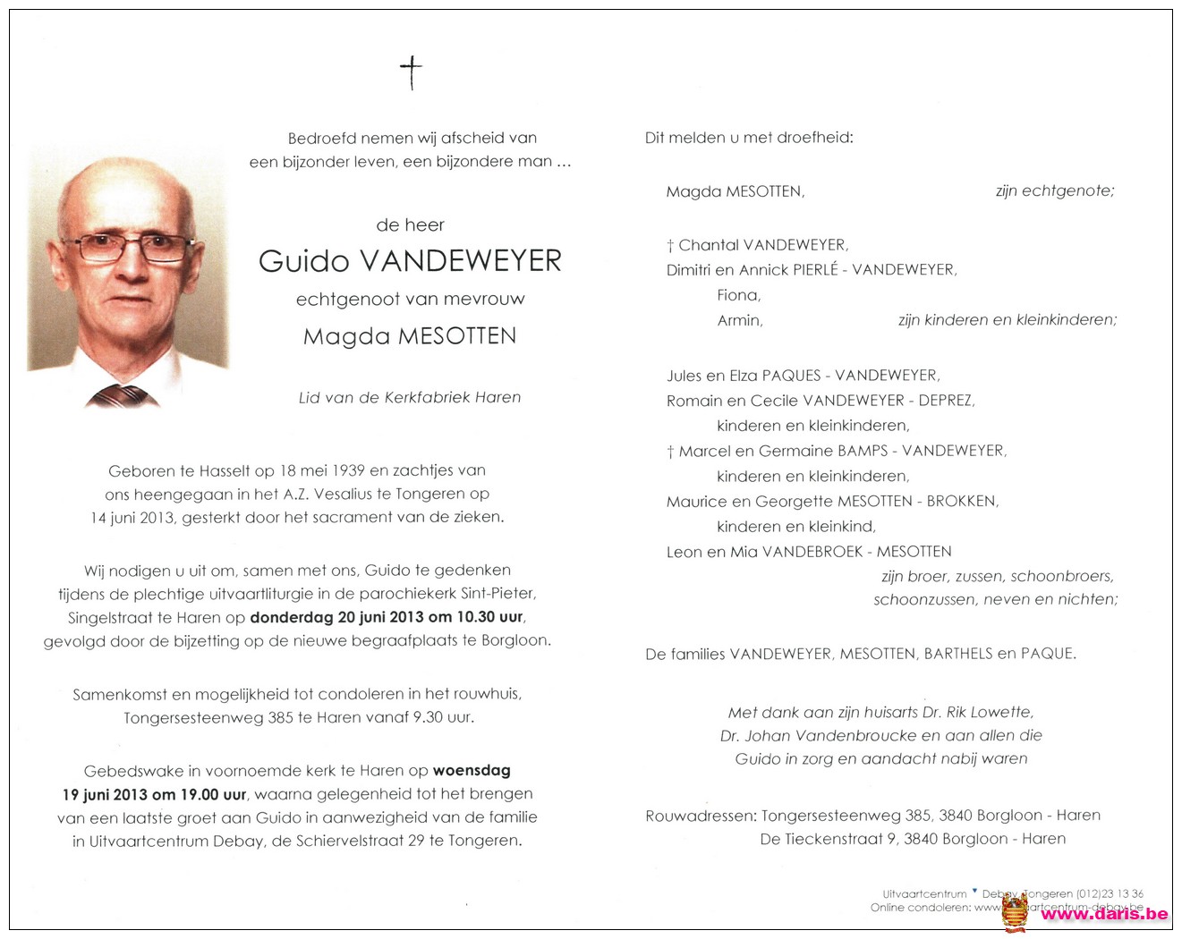 Vandeweyer, Guido, geboren op 18-05-1939 te Hasselt, overleden op 14-06-2013 te Tongeren op 74-jarige leeftijd.