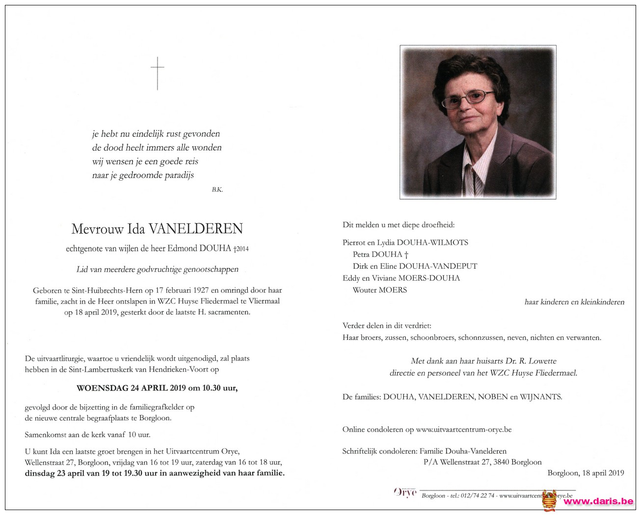 Vanelderen, Ida, geboren op 17-02-1927 te Sint-Huibrechts-Hern, overleden op 18-04-2019 te Vliermaal op 92-jarige leeftijd.