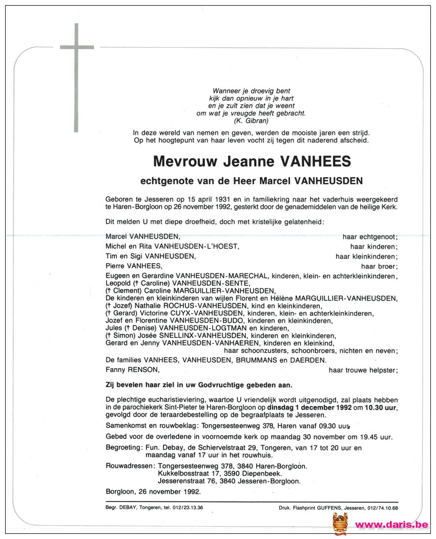 Vanhees, Jeanne, geboren op 25-04-1931 te Jesseren, overleden op 26-11-1992 te Haren op 61-jarige leeftijd.