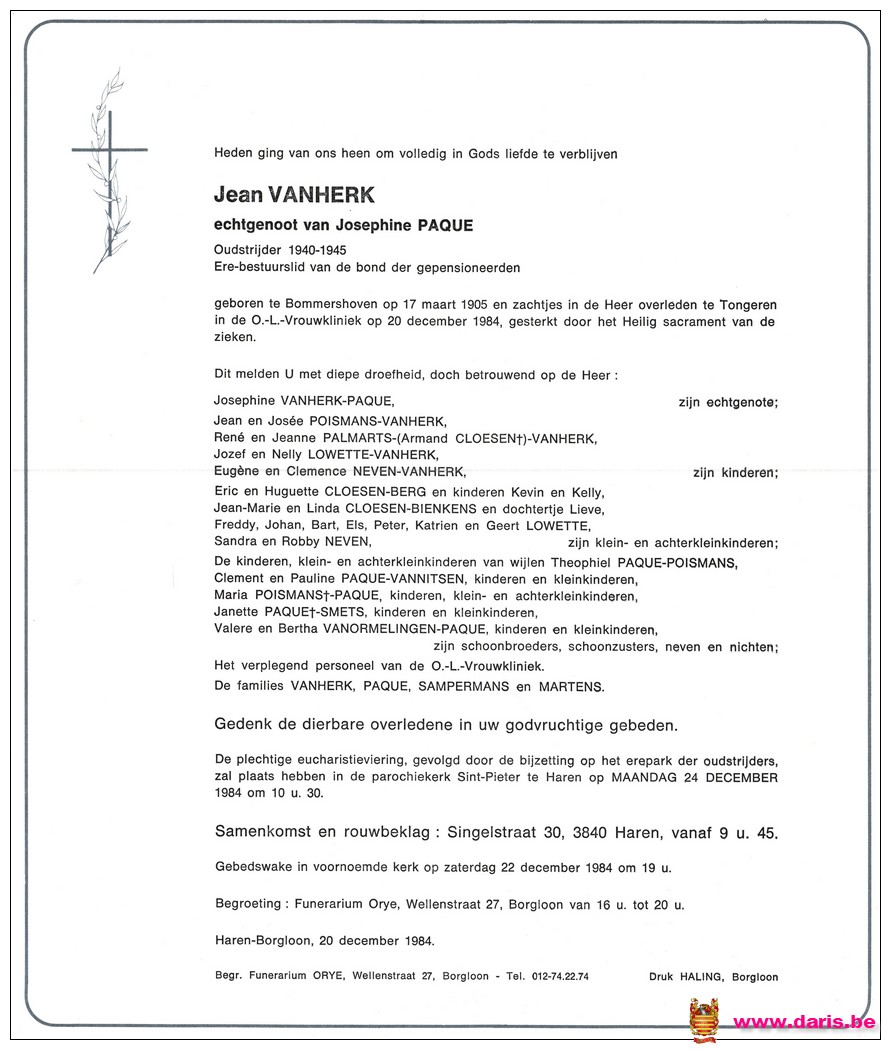 Vanherk, Jean, geboren op 17-03-1905 te Bommershoven, overleden op 20-12-1984 te Tongeren op 79-jarige leeftijd.