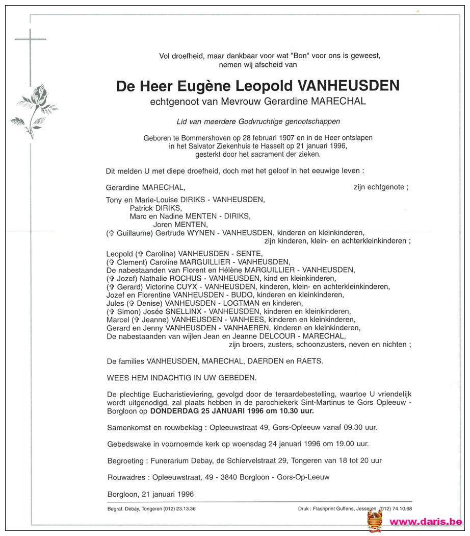 Vanheusden, Eugene, geboren op 28-02-1907 te Bommershoven, overleden op 21-01-1996 te Hasselt op 88-jarige leeftijd.