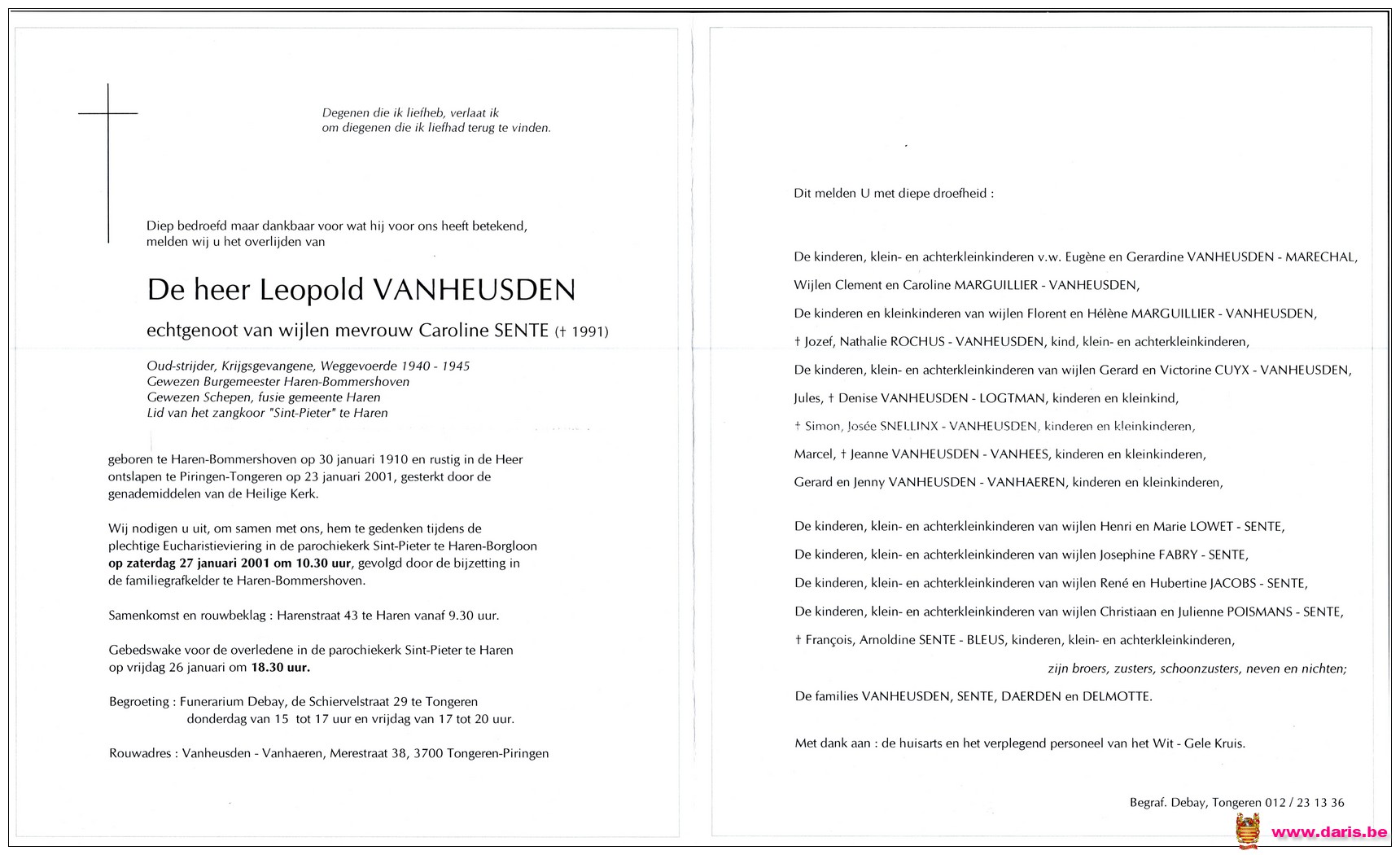 Vanheusden, Leopold, geboren op 30-11-1910 te Jesseren, overleden op 23-01-2001 te Piringen op 90-jarige leeftijd.