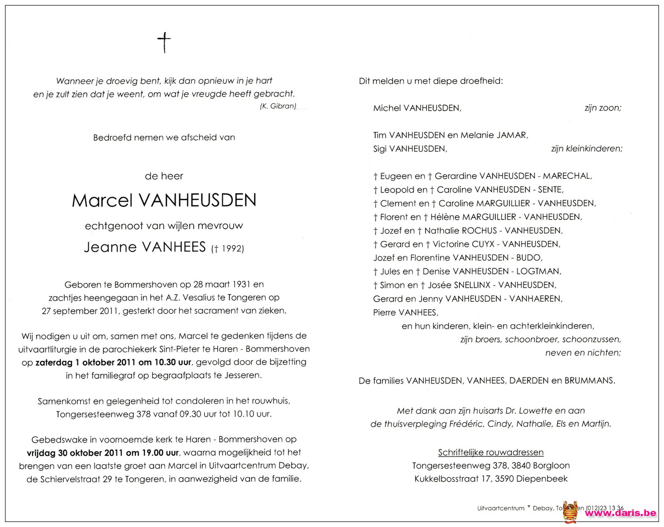 Vanheusden, Marcel, geboren op 28-03-1931 te Bommershoven, overleden op 27-09-2011 te Tongeren op 80-jarige leeftijd.