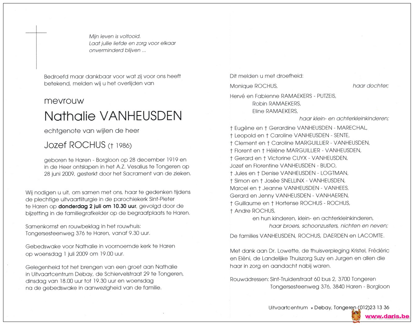 Vanheusden, Nathalie, geboren op 28-12-1919 te Bommershoven, overleden op 28-06-2009 te Tongeren op 89-jarige leeftijd.