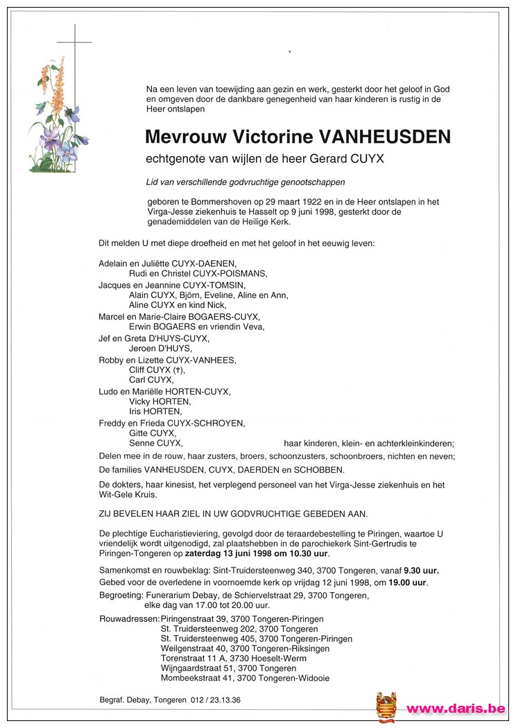 Vanheusden, Victorine, geboren op 29-03-1922 te Bommershoven, overleden op 09-06-1998 te Hasselt op 76-jarige leeftijd.