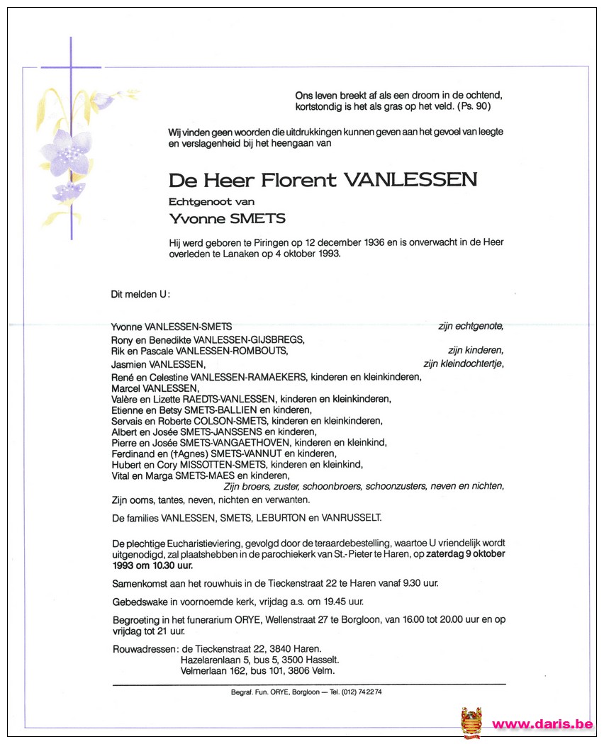 Vanlessen, Florent, geboren op 12-12-1936 te Piringen, overleden op 04-10-1993 te Lanaken op 56-jarige leeftijd.
