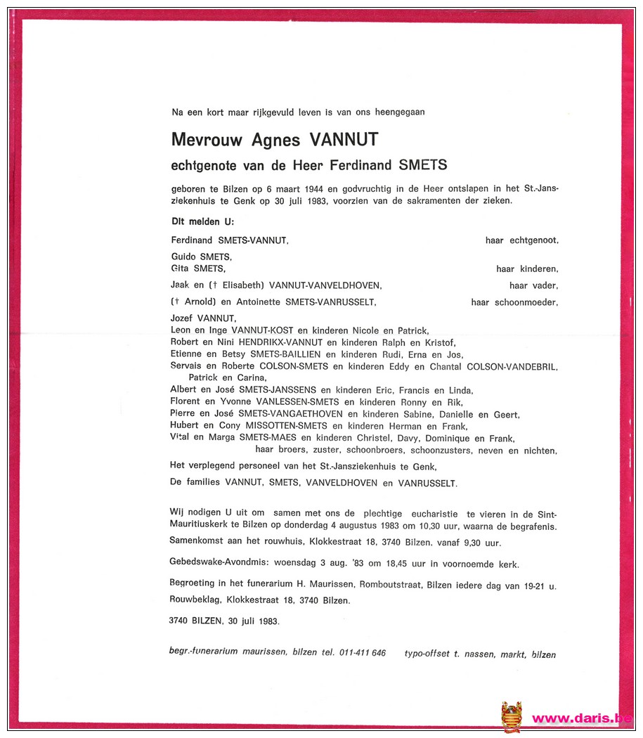 Vannut, Agnes, geboren op 06-03-1944 te Bilzen, overleden op 30-07-1983 te Genk op 39-jarige leeftijd.