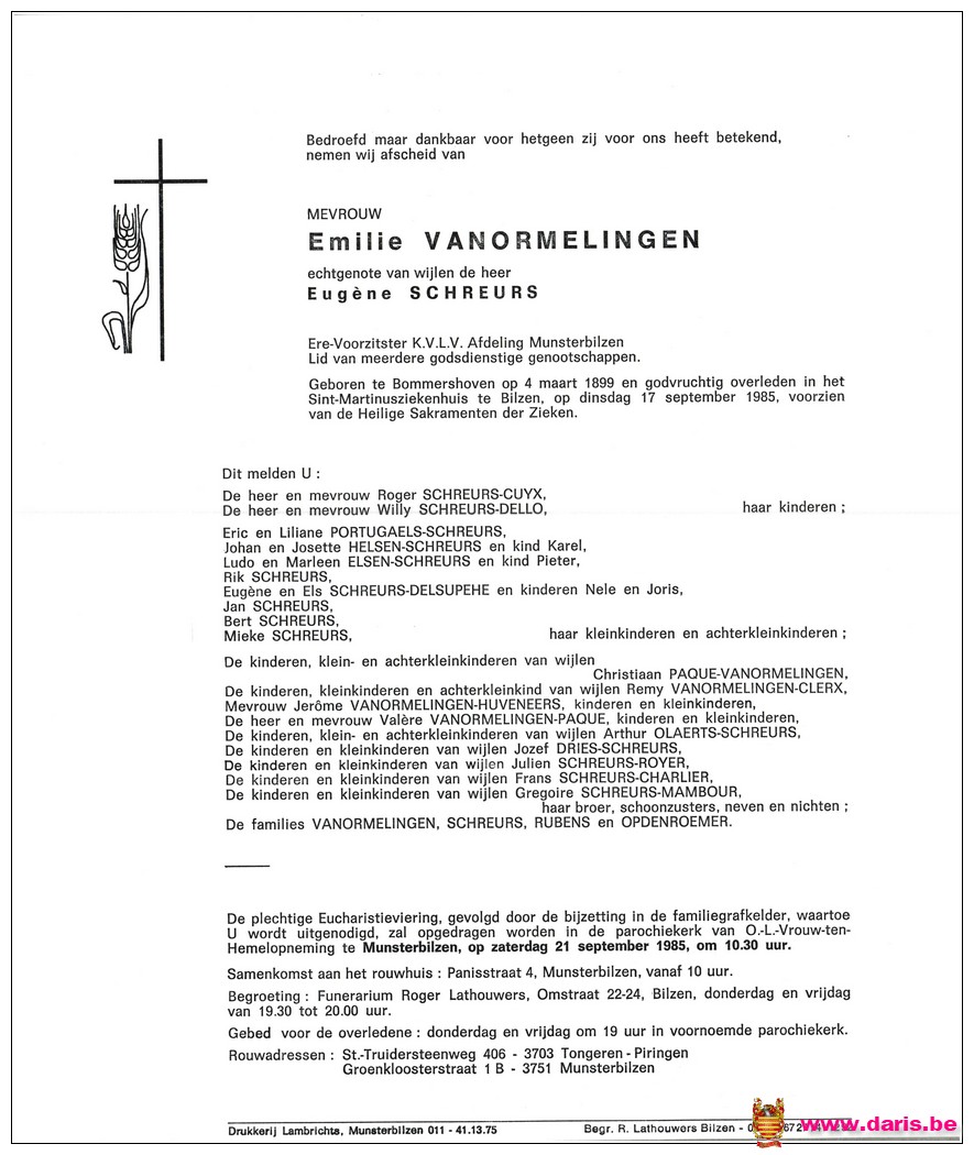 Vanormelingen, Emilie, geboren op 04-03-1899 te Bommershoven, overleden op 17-09-1985 te Bilzen op 86-jarige leeftijd.