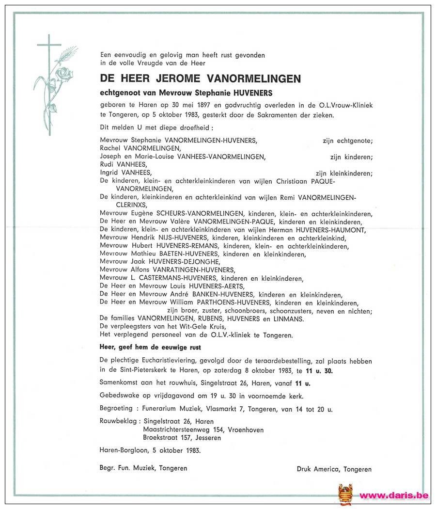 Vanormelingen, Jerome, geboren op 30-05-1897 te Bommershoven, overleden op 05-10-1983 te Tongeren op 86-jarige leeftijd.