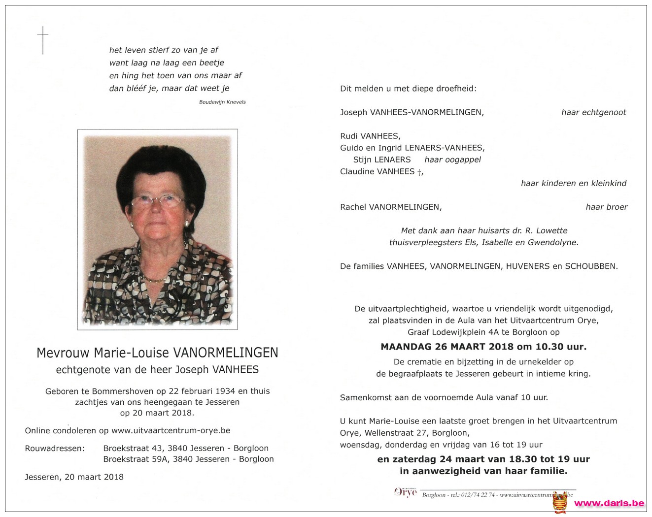 Vanormelingen, Marie‑Louise, geboren op 22-02-1934 te Bommershoven, overleden op 20-03-2018 te Jesseren op 84-jarige leeftijd.
