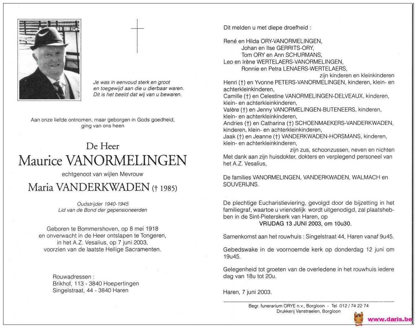 Vanormelingen, Maurice, geboren op 08-05-1918 te Bommershoven, overleden op 07-06-2003 te Tongeren op 85-jarige leeftijd.