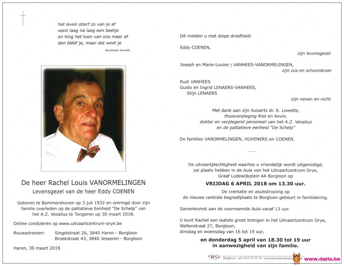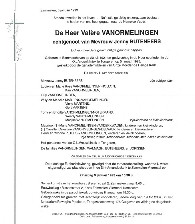 Vanormelingen, Valère, geboren op 20-07-1921 te Bommershoven, overleden op 05-01-1993 te Tongeren op 71-jarige leeftijd.