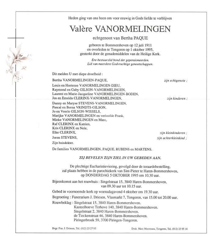 Vanormelingen, Valère, geboren op 12-07-1911 te Bommershoven, overleden op 01-10-1995 te Tongeren op 84-jarige leeftijd.