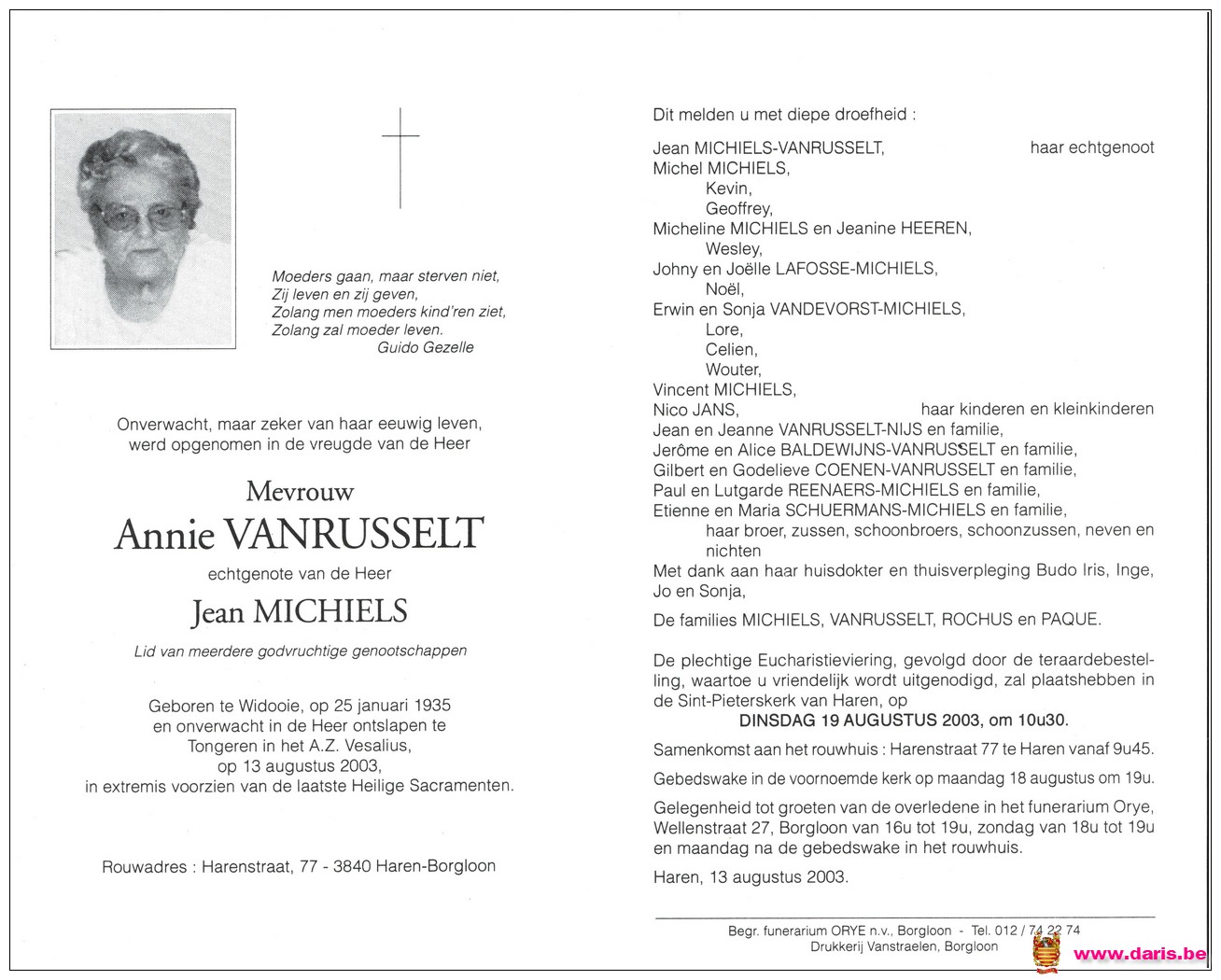Vanrusselt, Annie, geboren op 25-01-1935 te Widooie, overleden op 13-08-2003 te Tongeren op 68-jarige leeftijd.
