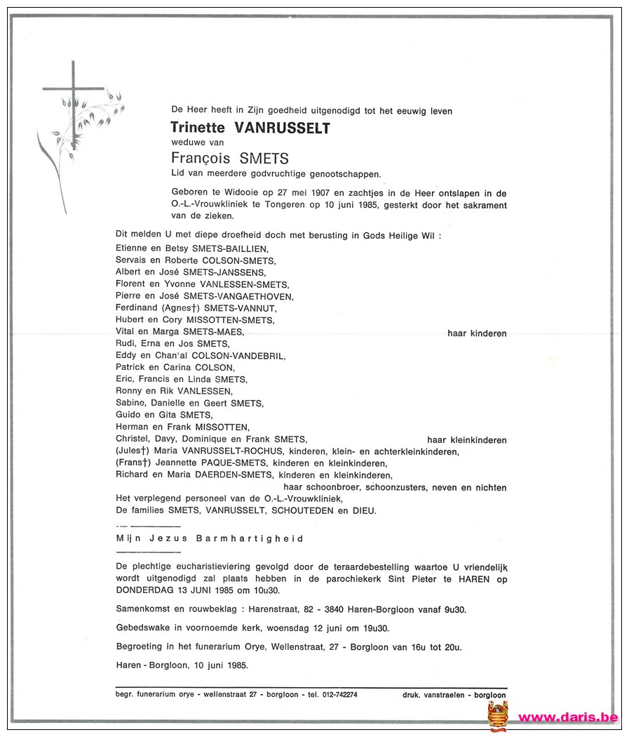 Vanrusselt, Trinette, geboren op 27-05-1907 te Widooie, overleden op 10-06-1985 te Haren op 78-jarige leeftijd.