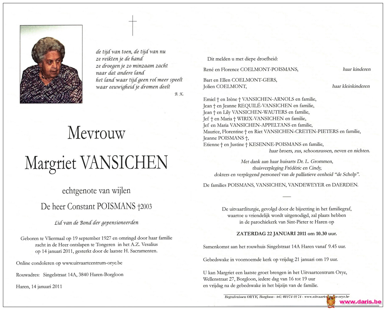 Vansichen, Margriet, geboren op 19-09-1927 te Vliermaal, overleden op 14-01-2011 te Tongeren op 83-jarige leeftijd.