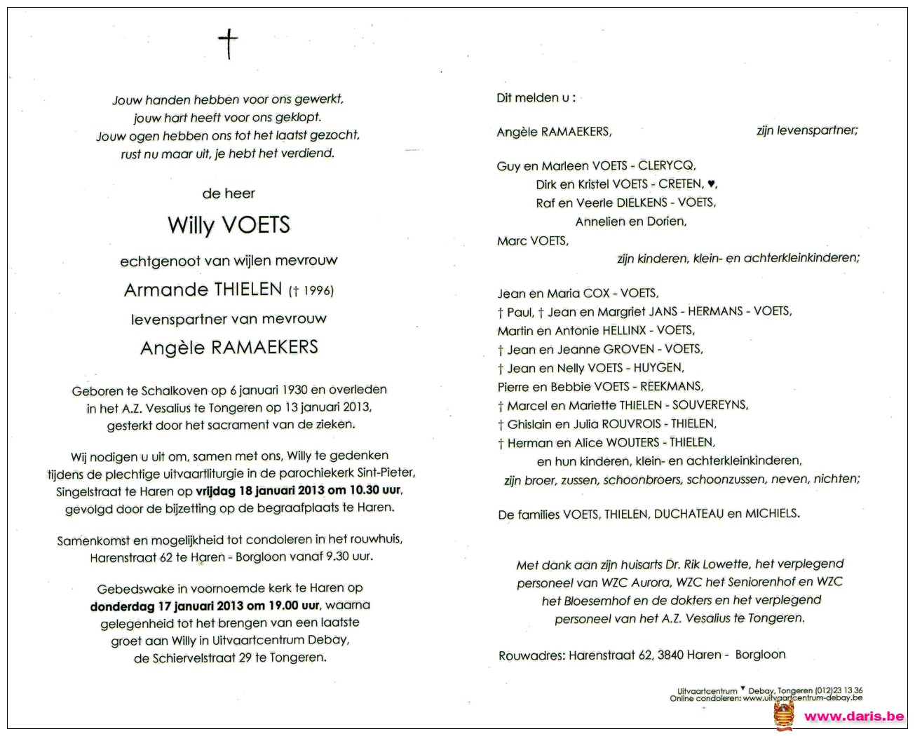 Voets, Willy, geboren op 06-01-1930 te Schalkhoven, overleden op 13-01-2013 te Tongeren op 83-jarige leeftijd.
