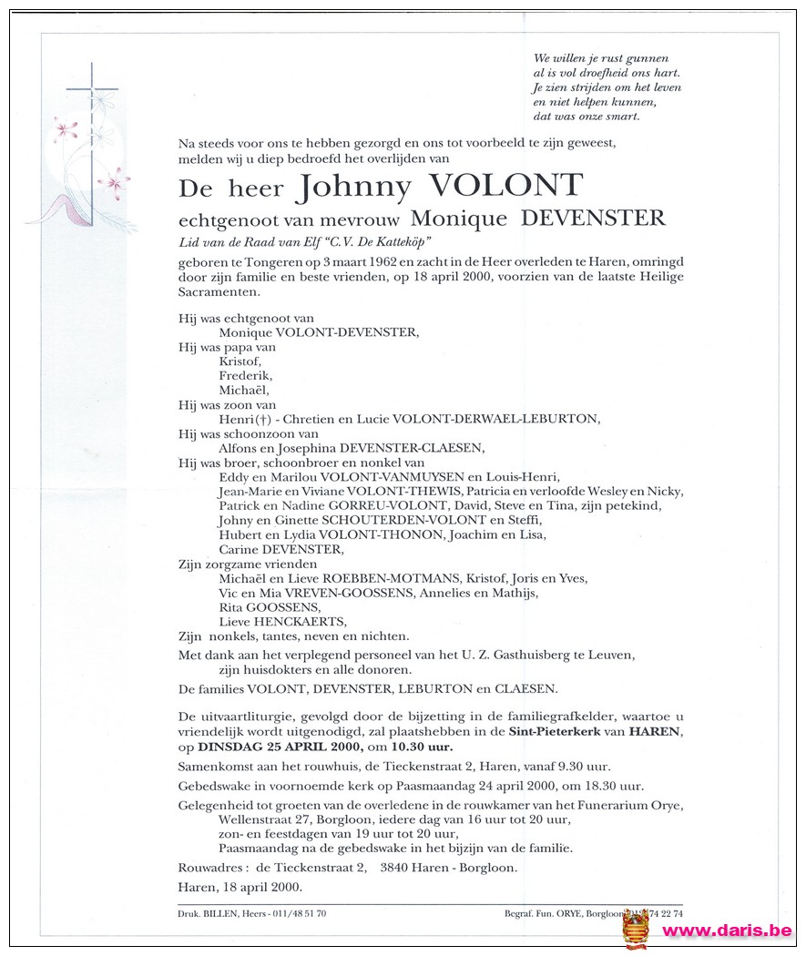 Volont, Johnny, geboren op 03-03-1962 te Tongeren, overleden op 18-04-2000 te Haren op 38-jarige leeftijd.
