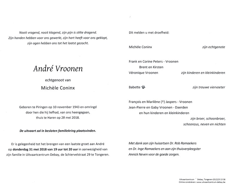 Vroonen, André, geboren op 10-11-1943 te Piringen, overleden op 28-05-2018 te Haren op 74-jarige leeftijd.