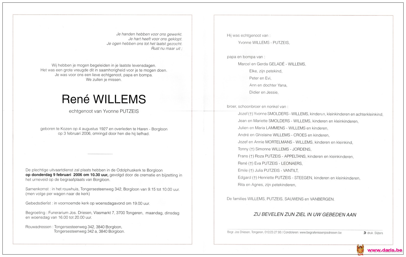 Willems, René, geboren op 04-08-1927 te Kozen, overleden op 03-02-2006 te Haren op 78-jarige leeftijd.