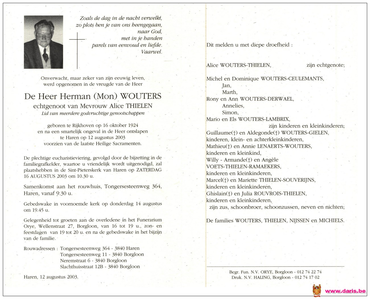 Wouters, Herman, geboren op 16-10-1924 te Rijkhoven, overleden op 12-08-2003 te Haren op 78-jarige leeftijd.
