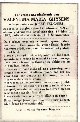 Ghysens, Valentina Maria, geboren op 17-02-1899 te Borgloon, overleden op 21-03-1947 te Borgloon op 48-jarige leeftijd, echtgenote van Teuchies Jozef.