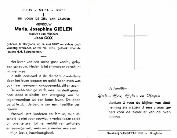 Gielen, Marie Josephine, geboren op 14-05-1887 te Borgloon, overleden op 20-05-1969 te Borgloon op 82-jarige leeftijd, gehuwd met Cox Jean.