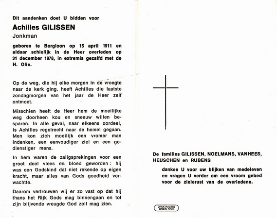 Gilissen, Achilles, geboren op 15-04-1911 te Borgloon, overleden op 31-12-1978 te Borgloon op 67-jarige leeftijd. Jonkman.