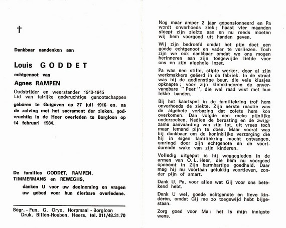Goddet, Louis, geboren op 27-07-1916 te Guigoven, overleden op 14-02-1984 te Borgloon op 67-jarige leeftijd, gehuwd met Rampen Agnes.
