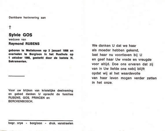 Gos, Sylvie, geboren op 02-01-1898 te Mettekoven, overleden op 01-10-1988 te Borgloon op 90-jarige leeftijd, gehuwd met Rubens Raymond.
