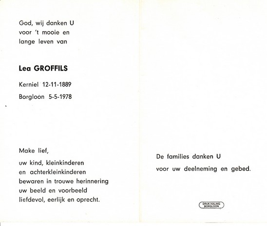 Groffils, Lea, geboren op 12-11-1889 te Kerniel, overleden op 05-05-1978 te Borgloon op 88-jarige leeftijd.