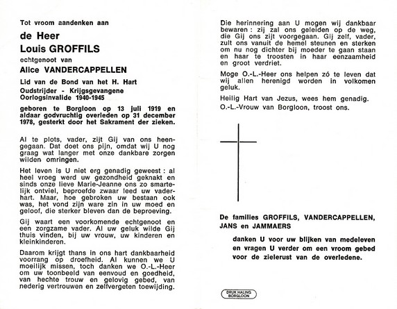 Groffils, Louis, geboren op 13-07-1919 te Borgloon, overleden op 31-12-1978 te Borgloon op 59-jarige leeftijd, gehuwd met Vandercappellen Alice.