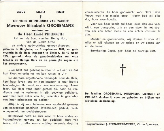 Grosemans, Elisabeth, geboren op 03-09-1881 te Borgloon, overleden op 10-03-1964 te Sluizen op 82-jarige leeftijd, gehuwd met Philippeth Emiel.