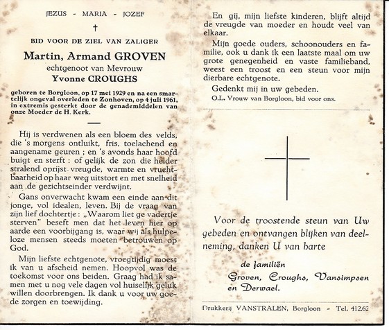 Groven, Martin Armand, geboren op 17-05-1929 te Borgloon, overleden op 04-07-1961 te Zonhoven op 32-jarige leeftijd, gehuwd met Croughs Yvonne.