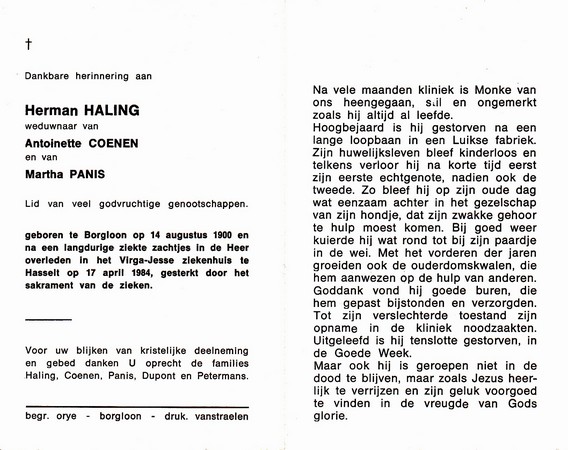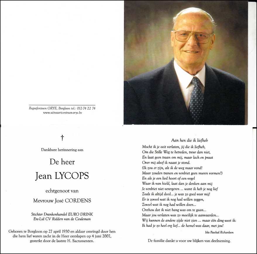 Ory, Jos, geboren op 14-08-1917 te Borgloon, overleden op 13-06-1999 te Poperinge op 81-jarige leeftijd, weduwnaar van Denut Charlotte.