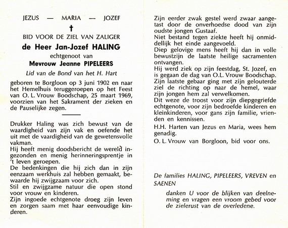 Pansaers, Jean, geboren op 20-08-1915 te Borgloon, overleden op 08-03-1990 te Borgloon op 74-jarige leeftijd, echtgenoot van Reweghs Maria.