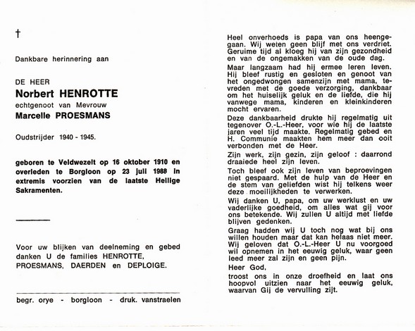 Noelanders, Martin, geboren op 28-01-1920 te Gotem, overleden op 18-08-2003 te Borgloon op 83-jarige leeftijd, weduwnaar van Strauvwen (1986) Julia.