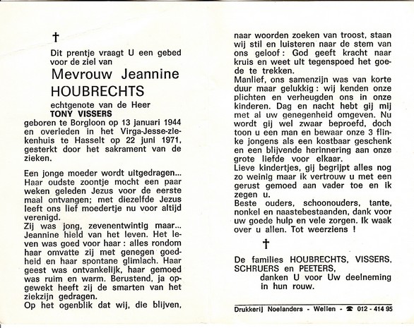 Noens, Julia, geboren op 09-05-1944 te Borgloon, overleden op 25-03-2005 te Tongeren op 60-jarige leeftijd, echtgenote van Schoeps Jean.