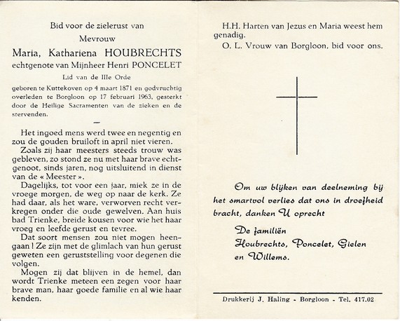 Ghysens, Maria, geboren op 27-01-1885 te Borgloon, overleden op 26-09-1968 te Tongeren op 83-jarige leeftijd, gehuwd met Olieslagers Pieter.