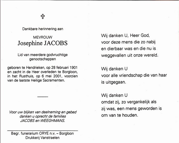 Groffils, Jeanne, geboren op 12-11-1920 te Borgloon, overleden op 24-01-2009 te Borgloon op 88-jarige leeftijd, weduwe van Schoofs (1995) Albert.