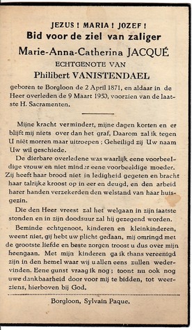 Orye, Maria Catharina, geboren op 27-11-1888 te Gutschoven, overleden op 12-02-1968 te Borgloon op 79-jarige leeftijd, gehuwd met Vijgen Guillaume.
