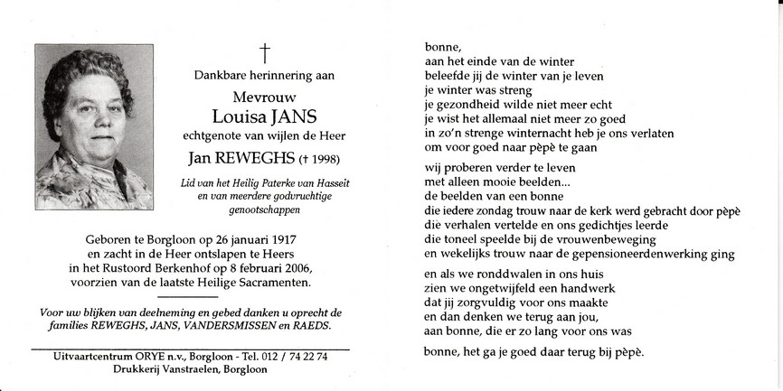 Olislagers, Louisa, geboren op 19-12-1914 te Borgloon, overleden op 10-05-2003 te Tongeren op 88-jarige leeftijd, weduwe van Lismont (1980) Jean.
