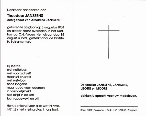 Orij, René, geboren op 04-07-1908 te Borgloon, overleden op 06-03-1991 te Borgloon op 82-jarige leeftijd, gehuwd met Berckenbosch Louisa.