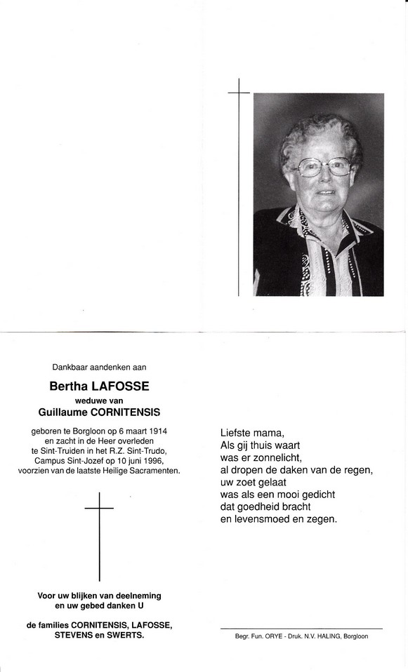 Groffils, Elsa, geboren op 09-03-1917 te Borgloon, overleden op 04-12-1998 te Borgloon op 81-jarige leeftijd, echtgenote van Vrancken Justin.
