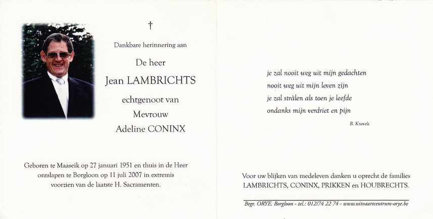 Olislagers, Jean, geboren op 19-09-1924 te Borgloon, overleden op 07-07-1980 te Borgloon op 55-jarige leeftijd, gehuwd met Olislagers Jenny.