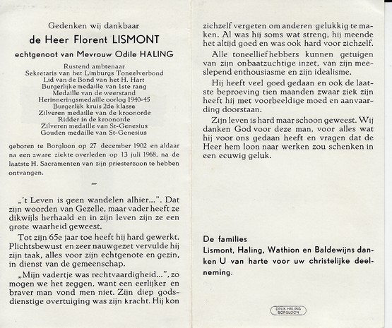 Gilissen, Albert, geboren op 11-01-1915 te Borgloon, overleden op 23-03-1992 te Borgloon op 77-jarige leeftijd, gehuwd met Vanhees Louisa.