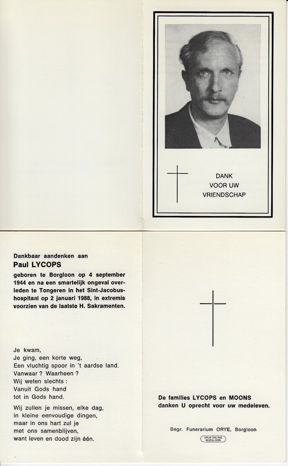 Paulus, Jean, geboren op 07-01-1926 te Borgloon, overleden op 24-11-1989 te Lanaken op 63-jarige leeftijd, gehuwd met Teuchie Hubertine.
