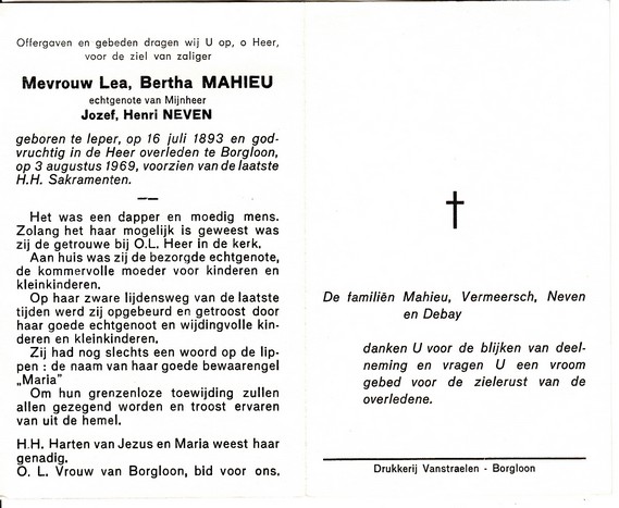 Neven, Maria, geboren op 23-02-1922 te Borgloon, overleden op 22-08-1998 te Tongeren op 76-jarige leeftijd, echtgenote van Derwael Martin.
