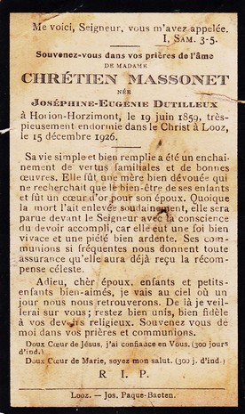 Orij, Hubertine, geboren op 21-03-1894 te Borgloon, overleden op 25-08-1984 te Borgloon op 90-jarige leeftijd, gehuwd met Claesen Jozef.